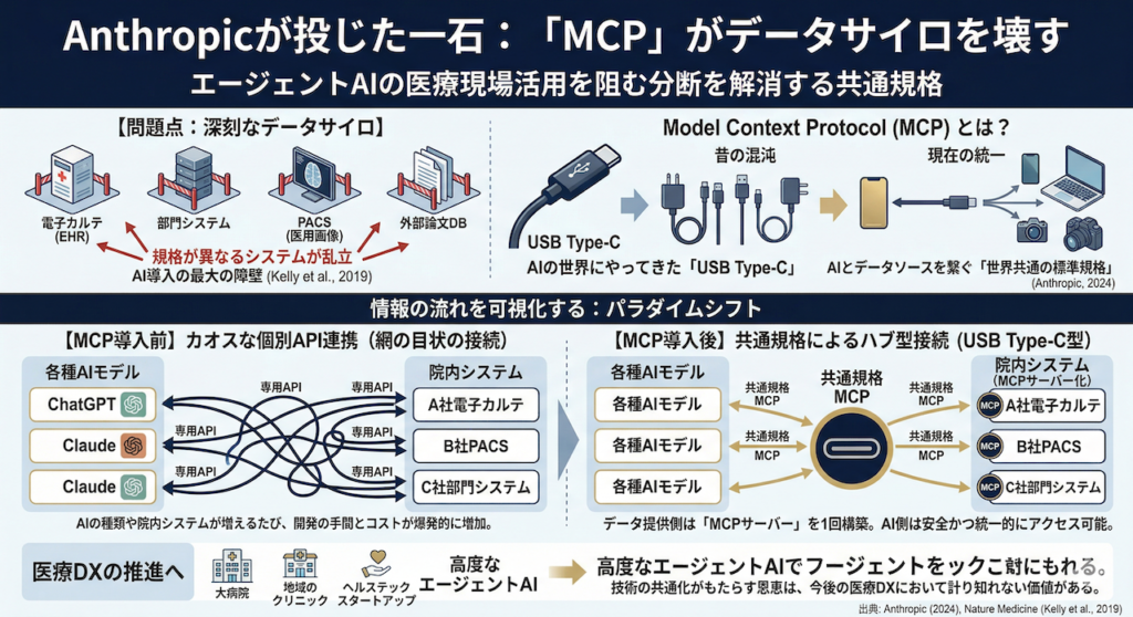 電子カルテ(EHR)、各種の部門システム、PACS(医用画像管理システム)、さらには外部の医学論文データベースなど、規格がまったく異なるシステムが乱立しています。科学誌『Nature Medicine』に掲載されたKellyらの研究でも指摘されているように、こうした医療データの分断(相互運用性の欠如)は、AIを臨床現場に導入し、インパクトをもたらすための最大の障壁の一つとなっています(Kelly et al., 2019)。これまで、AIをこれらのシステムと連携させるには、ベンダーごとに「個別のAPI連携」をゼロから開発する必要があり、莫大なコストと時間がかかっていました。