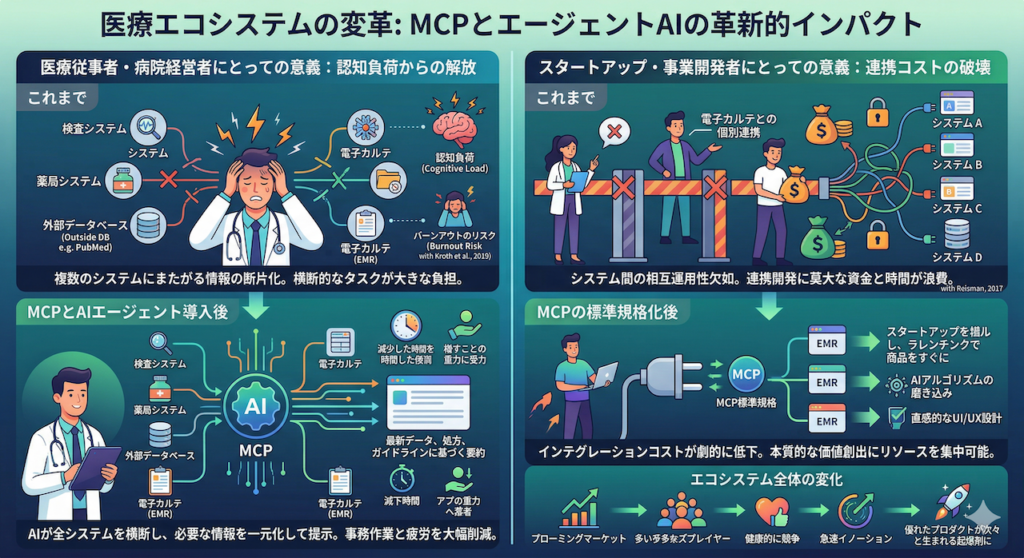 MCPとエージェントAIの組み合わせがもたらす変化は、「AIがこれまでより少し便利になる」といった表面的なレベルにはとどまりません。医療機関におけるシステム導入のあり方から、ヘルステック・スタートアップの事業戦略に至るまで、エコシステム全体に直接的かつ絶大なインパクトを与えます。具体的にどのような変化が起きるのか、立場別にもう少し深く掘り下げてみましょう。