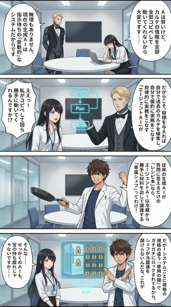 2022年末のChatGPT登場以降、医療現場でも文章要約や翻訳、基礎的な疾患情報の検索など、生成AI(Generative AI)の活用が模索されてきました。しかし、現在主流の生成AIには構造的な限界があります。それは「ユーザーがプロンプトで指示を与えない限り動けない」という受動的な性質と、回答の根拠となるデータがAI自身の事前学習データか、その場で入力したテキストに限定される点です。