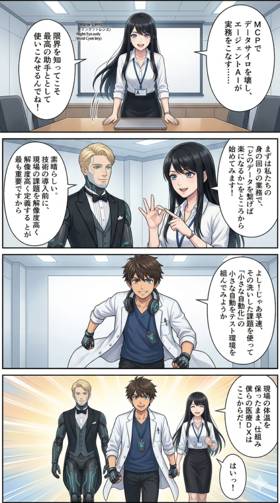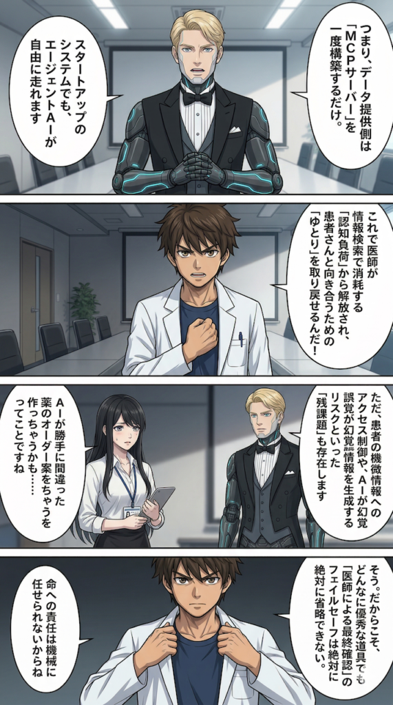 これによって、資金力のある大病院だけでなく、リソースの限られた地域のクリニックや、新しいアイデアを持ったヘルステックスタートアップであっても、高度なエージェントAIを自分たちのデータと連携させて活用できる道が開かれるのです。技術の共通化がもたらすこの恩恵は、今後の医療DXにおいて計り知れない価値があると思います。