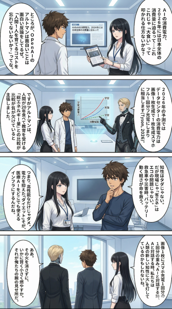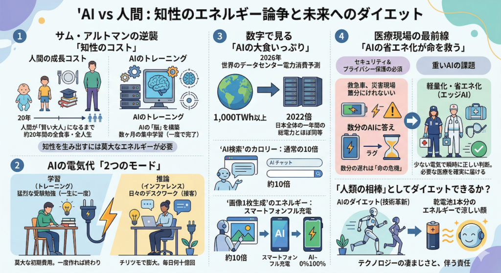 本記事では、この「人間 vs AI」のエネルギー論争を起点に、最新の調査データからAIの消費電力の実態を紐解き、実社会(特に医療分野)においてなぜ「AIの省エネ化」が命を救う鍵となるのかを、分かりやすく徹底解剖します。