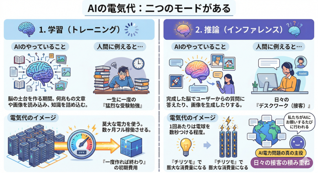 そもそもAIは、一体何にそんなに電気を使っているのでしょうか?これを直感的に理解するには、私たち人間の「受験勉強」と「社会人としての毎日の仕事」の2つの期間に分けて考えるとスッキリします。