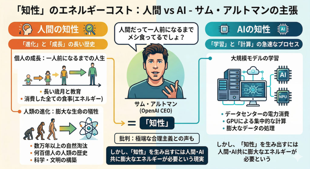 2026年2月、アルトマン氏はインドで開催されたサミットなどで、AIの電力消費への批判を「不公平な比較だ」と一蹴しました。テック系メディアなどでも報じられた彼の「人間との比較論理」は、次のような驚くべきものでした(Tyson, 2026)。