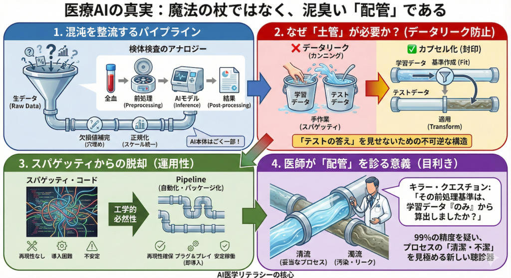 医療AIの「配管(パイプライン)」構築 AI開発の9割はモデル調整ではなく「泥臭い配管工事」です。データリーク(カンニング)を防ぎ、臨床で安全に動くシステムを作るための最重要概念を図解します。 🧪 検体検査の比喩 AI開発は、生データ(全血)からノ...