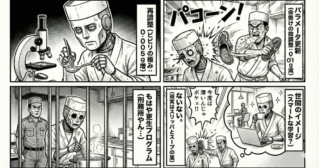 で、カウンターの向こうには、「味の正解」を知り尽くした頑固オヤジ(損失関数)が、腕組んで男梅みたいな血管ブチ切れそうな顔で座っとるわけです。