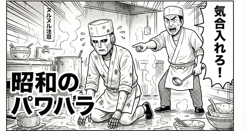 これ、要するに「床がヌルヌルのラーメン屋で繰り広げられる、昭和のパワハラ修行」のことなんですよ。