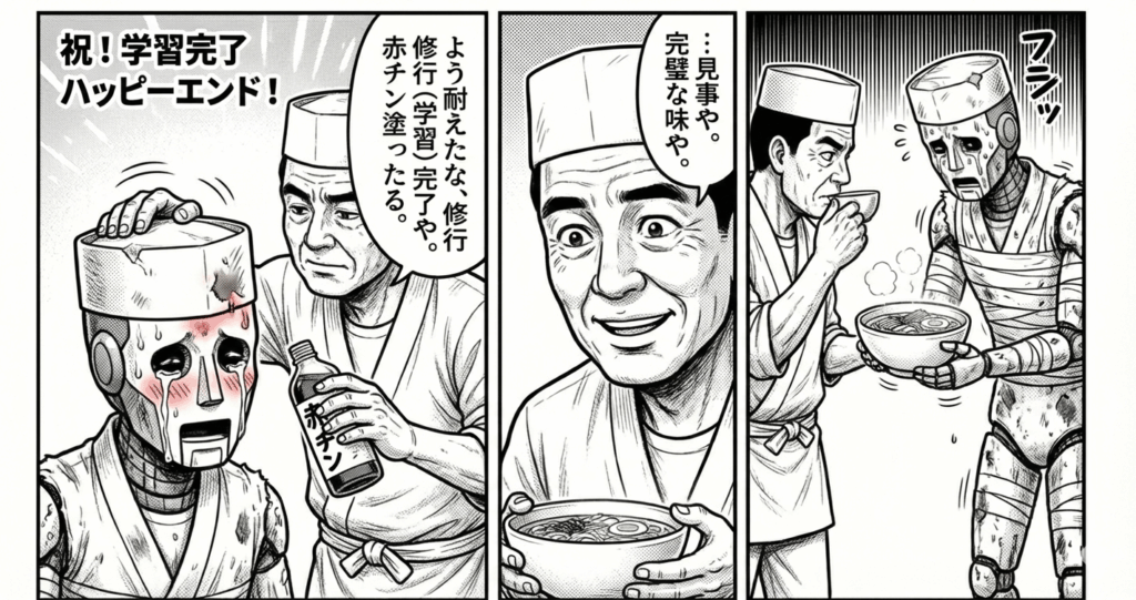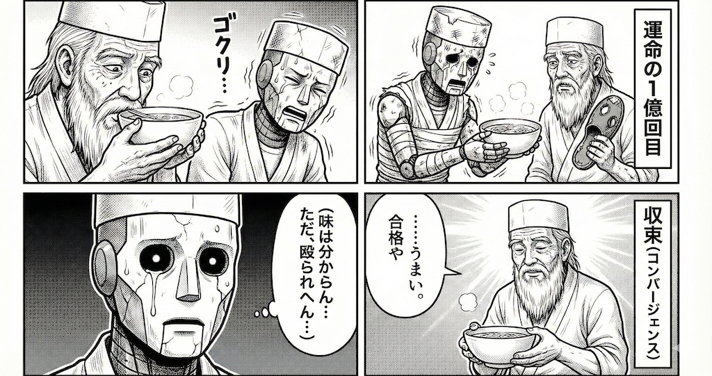 厨房に、まだ右も左も分からん、なんなら「舌がゴムパッキンで出来てるんか?」レベルの味覚神経が全部死んでるポンコツの弟子(AIモデル)がおるとします。