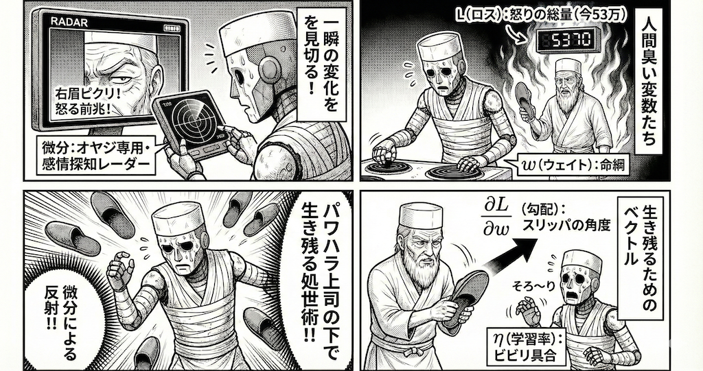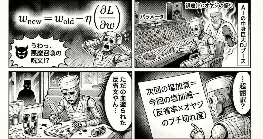 - \( \dfrac{\partial L}{\partial w} \) (勾配): 「スリッパの飛んでくる角度」です。「塩を増やしたら殺気立つか? 減らしたら落ち着くか?」という方向性を示してます。「塩を増やした瞬間、オヤジがスリッパに手を伸ばした! ということは逆や! 減らすのが正解や!」という、生き残るためのベクトルです。
