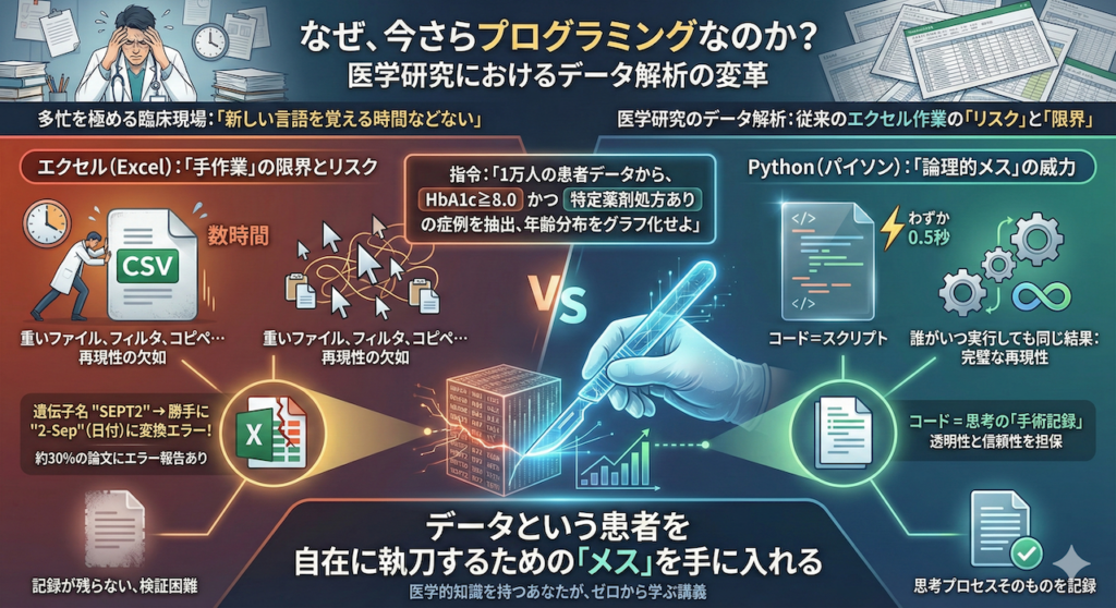 「多忙を極める臨床の現場で、新しい言語を覚える時間などない」。そう思われるのは当然です。しかし、医学研究におけるデータ解析の現場では、従来のエクセル(Excel)作業が抱える「リスク」と「限界」が浮き彫りになっています。