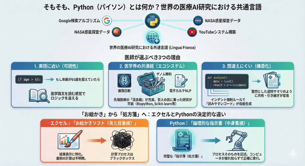 Pythonは「人間が読むこと」を最優先に設計されています。例えば、if age > 65: というコードは、「もし年齢が65歳を超えていたら」という自然な英語としてそのまま読めます。複雑な記号が少なく、医学論文を読むような感覚でロジックを追うことができます (Bassett et al. 2019)。