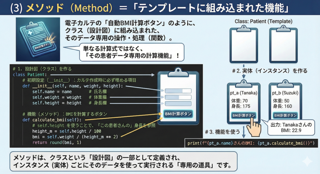 print(f"{pt_a.name}さんのBMI: {pt_a.calculate_bmi()}")