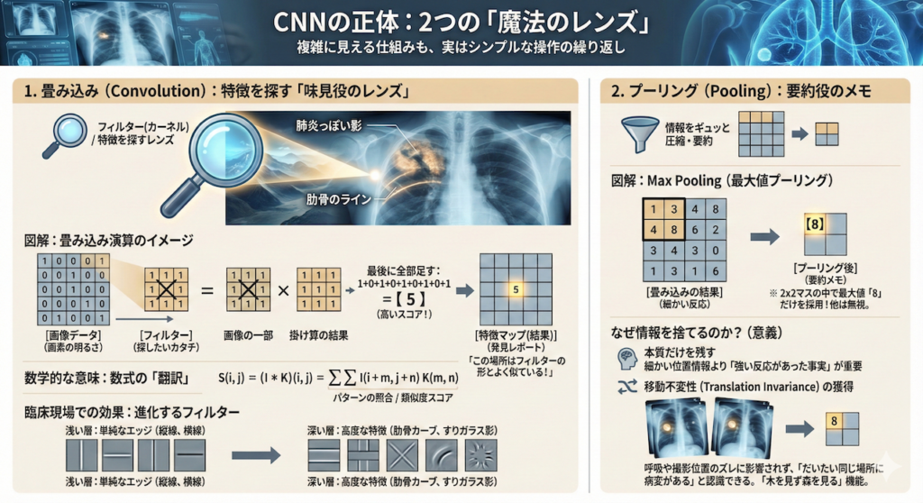 - 移動不変性(Translation Invariance)の獲得:これが最大のメリットです。患者さんが呼吸で少し動いたり、レントゲンの撮影位置が数ミリずれたりしても、プーリングで情報を要約しておけば、AIは「だいたい同じ場所に病変がある」と認識できます。