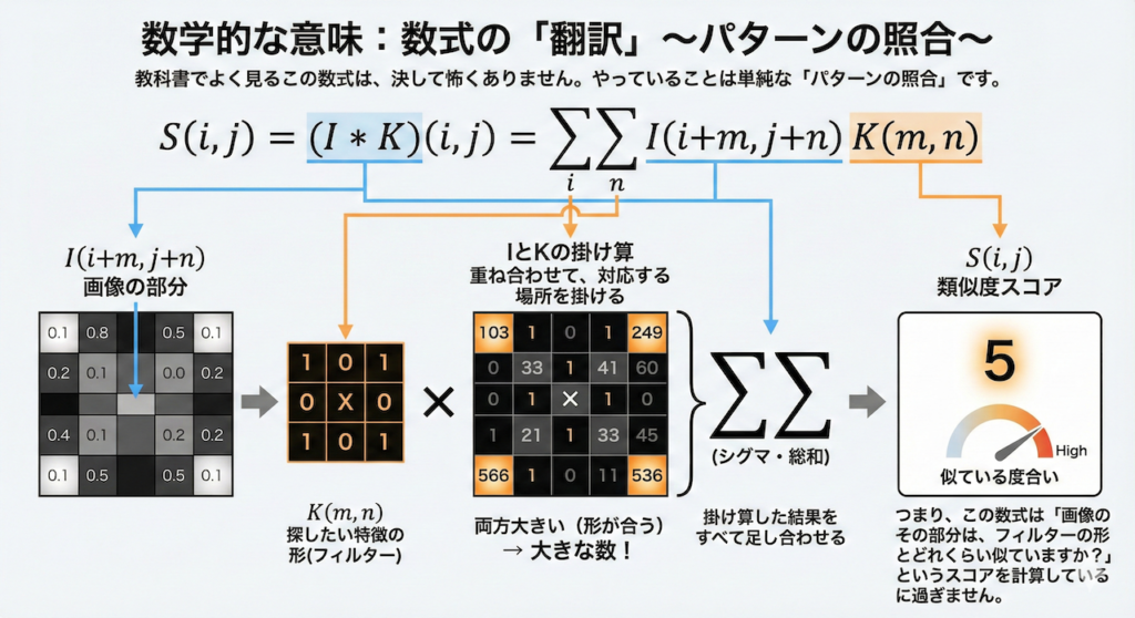 - \( I \) と \( K \) の掛け算:画像の部分 \( I \) と、探したい特徴の形 \( K \) を重ね合わせます。両方とも数値が大きい(真っ白な)場所は、掛け算するととても大きな数になります。逆に形が合わないと数値は小さくなります。