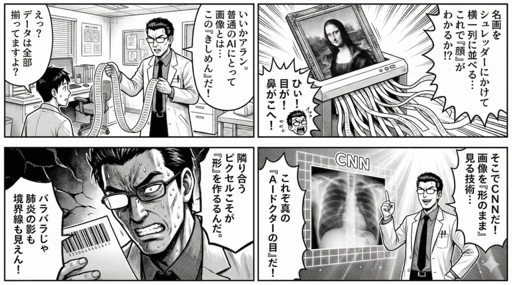 CNNは、画像の「形」を壊さずに診断できる、まさに「AIドクターの目」となるために生まれた技術なのです。