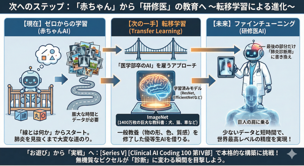 [Series V] や [Clinical AI Coding 100 第IV部] では、この転移学習を駆使し、実際の公開データセットを使った本格的な肺炎検出モデルの構築に挑戦します。