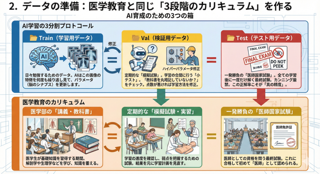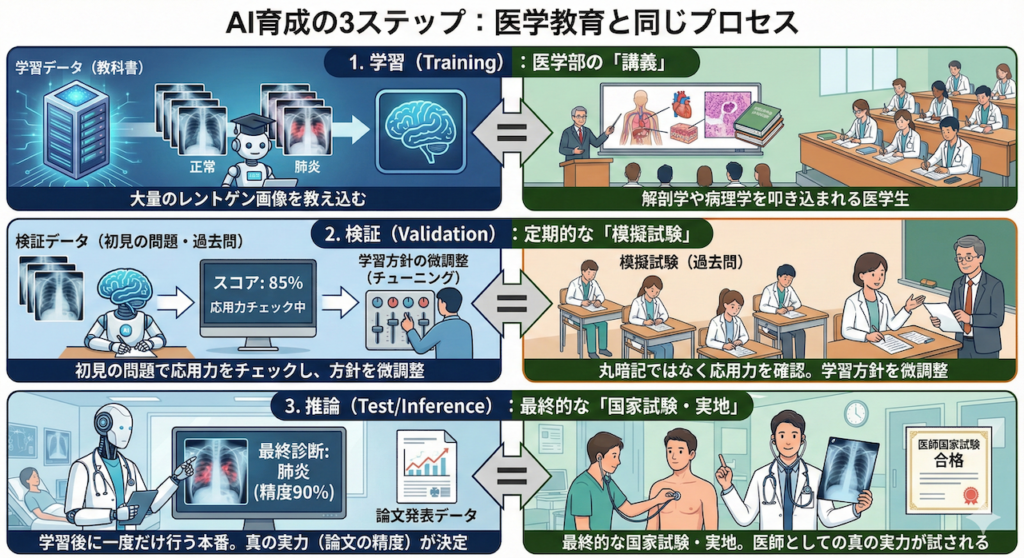 AIを育てる手順は、実は私たち医療従事者が歩んできた道(医学教育)と驚くほど似ています。