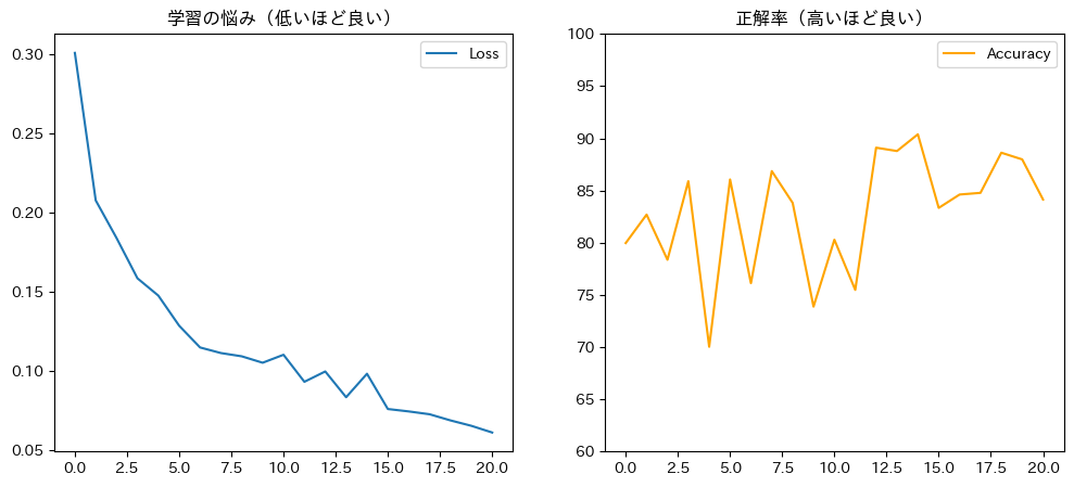 特に注目すべきは、「学習ロス(Training Loss)」と「模擬試験正解率(Val Accuracy)」の関係です。