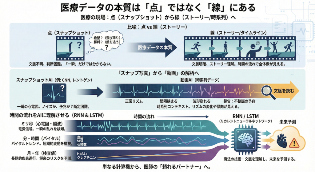 これまで学んできた画像認識AI(CNNなど)は、いわばレントゲン写真のような「スナップ写真(点)」を見て判断する技術でした。しかし、実際の臨床現場にあるデータの大半は、時間とともに刻一刻と変化する「時系列データ(Time Series Data)」です。