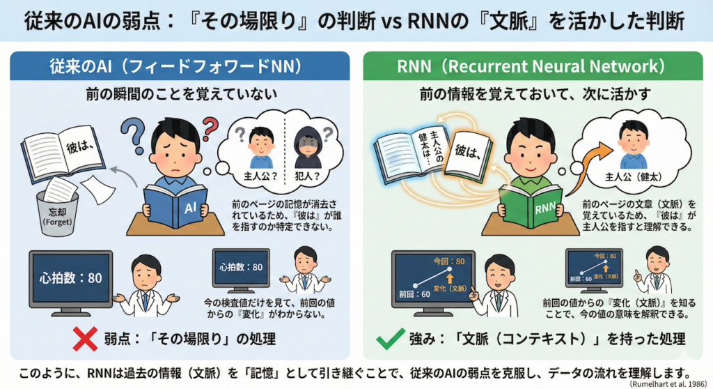 時系列データを扱うために、まず私たちが乗り越えなければならない壁があります。それは、従来のAI(ニューラルネットワーク)が抱えていた「健忘症」という問題です。