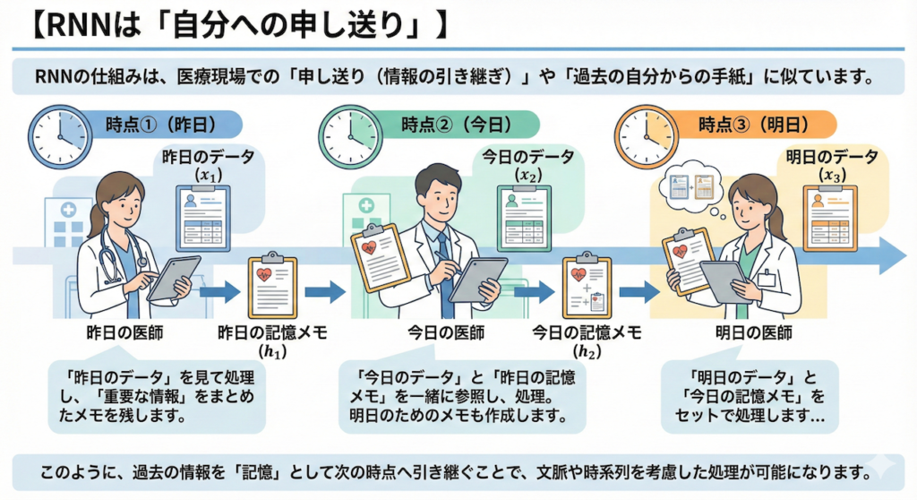RNNの仕組みは、医療現場での「申し送り(情報の引き継ぎ)」に似ています。あるいは、「過去の自分から手紙を受け取り、それを読んでから今の仕事をして、未来の自分へ手紙を書く」作業とも言えます。