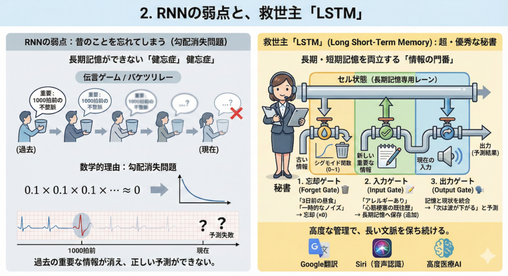 例えば、数時間続く心電図モニターにおいて、「1000拍前の不整脈(リズムの特徴)」が、現在の発作の前兆として極めて重要な意味を持つことがあります。しかし、普通のRNNでは、そこまで辿り着く前に記憶が消えてしまい、正しい予測ができないのです。
