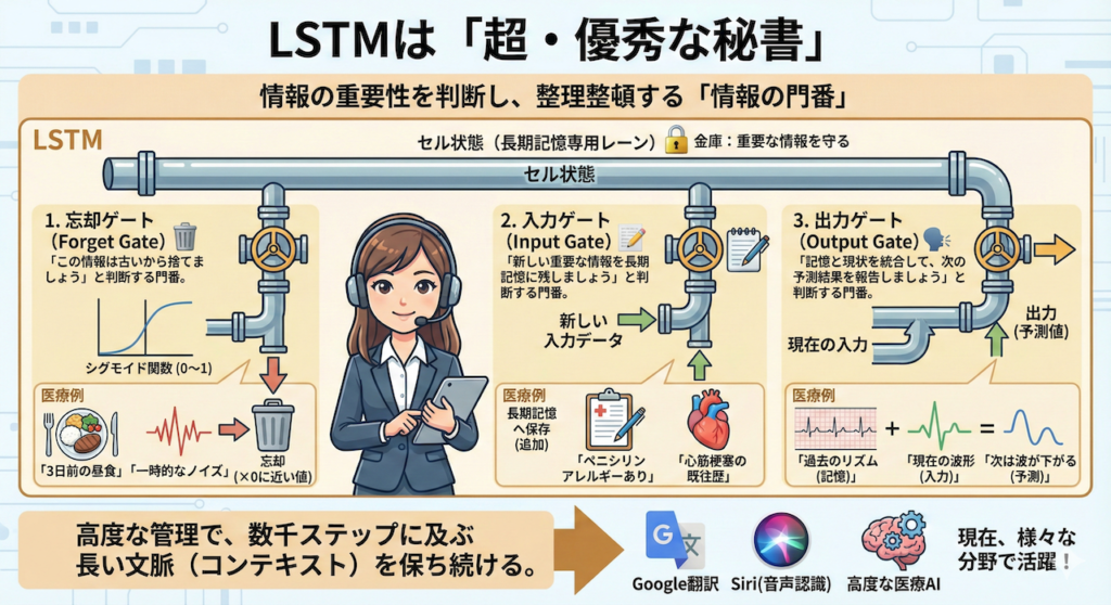 RNNが、入ってきた情報を右から左へ受け流す「ただ情報を横流しにする人」だとしたら、LSTMは、情報の重要性を判断して整理整頓する「超・優秀な秘書」です。