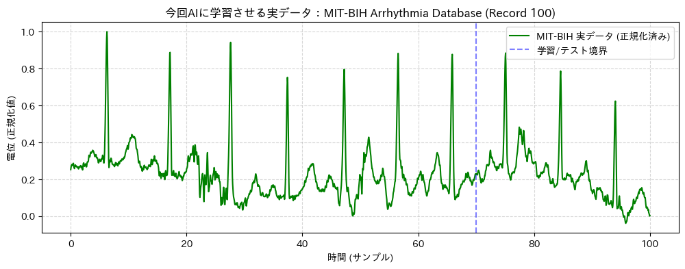 今回は、合成された波形ではなく、本物の医療データ(実際の患者さんの心電図)を使用します。 AIが、不整脈やノイズが含まれた「リアルな生体データ」の法則を学習し、その続きを予測できるか挑戦します。