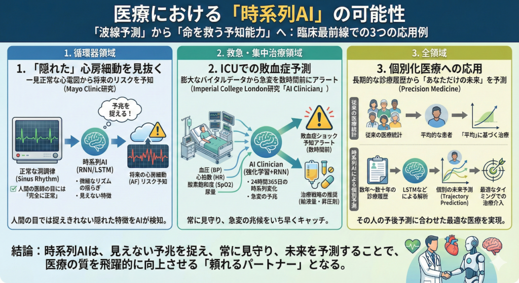 時系列AI(RNN/LSTMなど)は、現在、臨床の最前線でどのように役立っているのでしょうか? 代表的な3つの応用例を見てみましょう。