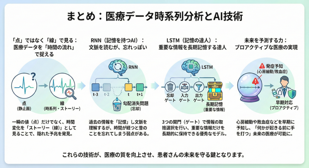 今回の講義では、医療データを「時間の流れ」として捉えることの重要性と、それを解析するAI技術について学びました。ポイントを振り返りましょう。