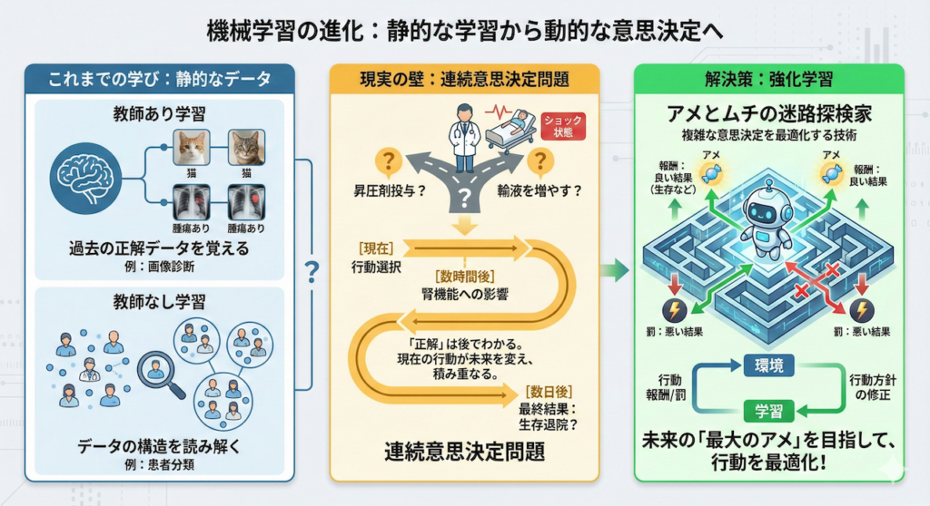 これまで私たちは、過去の正解データを覚える「教師あり学習」(例:画像診断)や、データの構造そのものを地図のように読み解く「教師なし学習」(例:患者分類)について学んできました。