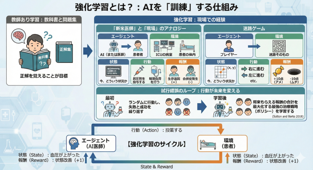 この「試行錯誤(Trial and Error)」を何千回、何万回と繰り返すことで、AIは「どの状態でどう動けば、将来もらえる報酬の合計(期待値)が最大になるか」という、最強の治療戦略(ポリシー)を学習していくのです (Sutton and Barto 2018)。