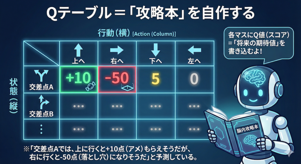 最も基本的なアルゴリズムであるQ学習(Q-Learning)では、「Qテーブル」と呼ばれるカンニングペーパー(行動価値関数)を作成し、そこに経験を書き込んでいきます。