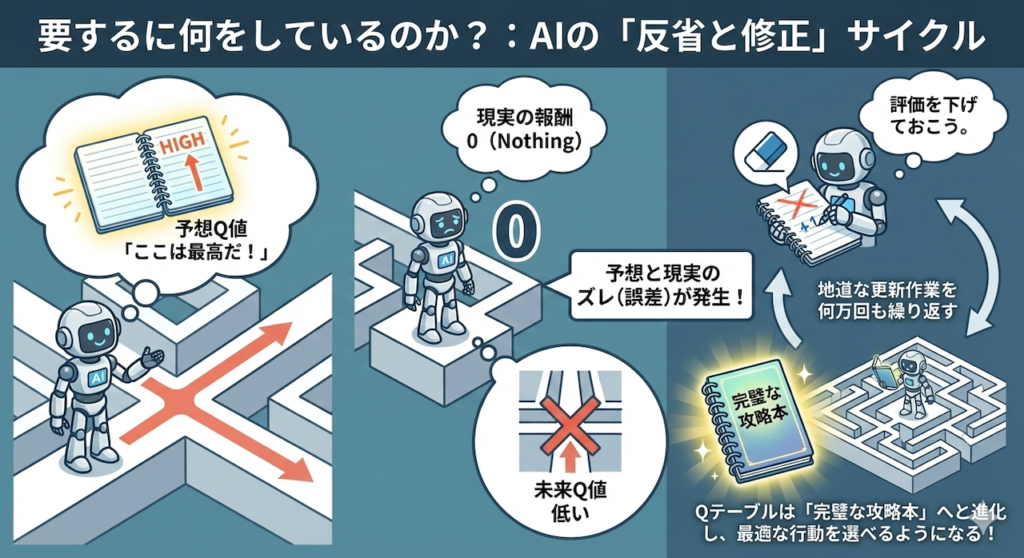 「『ここは最高だ(予想Q値)』と思ってたけど、実際に行ってみたら何もなかったし(報酬ゼロ)、その先も行き止まりだった(未来Q値も低い)。