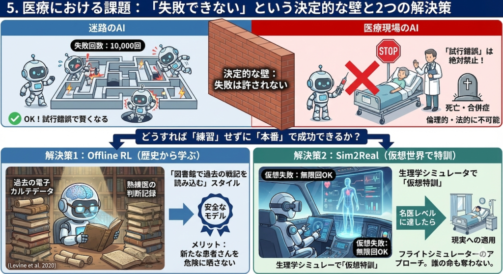 迷路のAIは、1万回落とし穴に落ち、壁に激突し続けることで賢くなりました。しかし、現実の患者さんで「試行錯誤(Exploration)」することは絶対に許されません。
