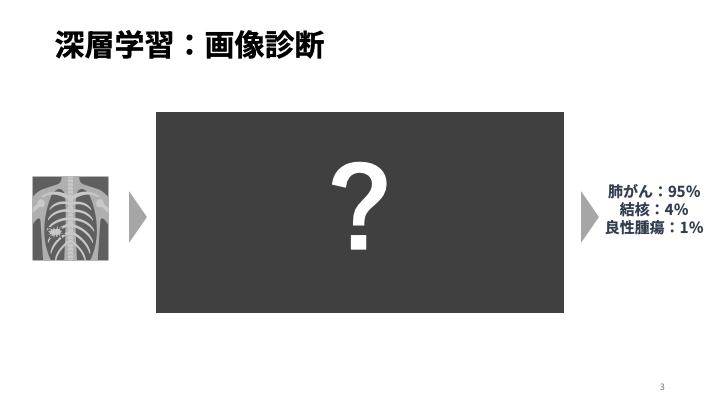 - 医療画像なら、「腫瘍っぽい形とか、怪しそうな濃淡パターン」とか、医者が「ん?」て目を凝らすとこを自動で学ぶ。