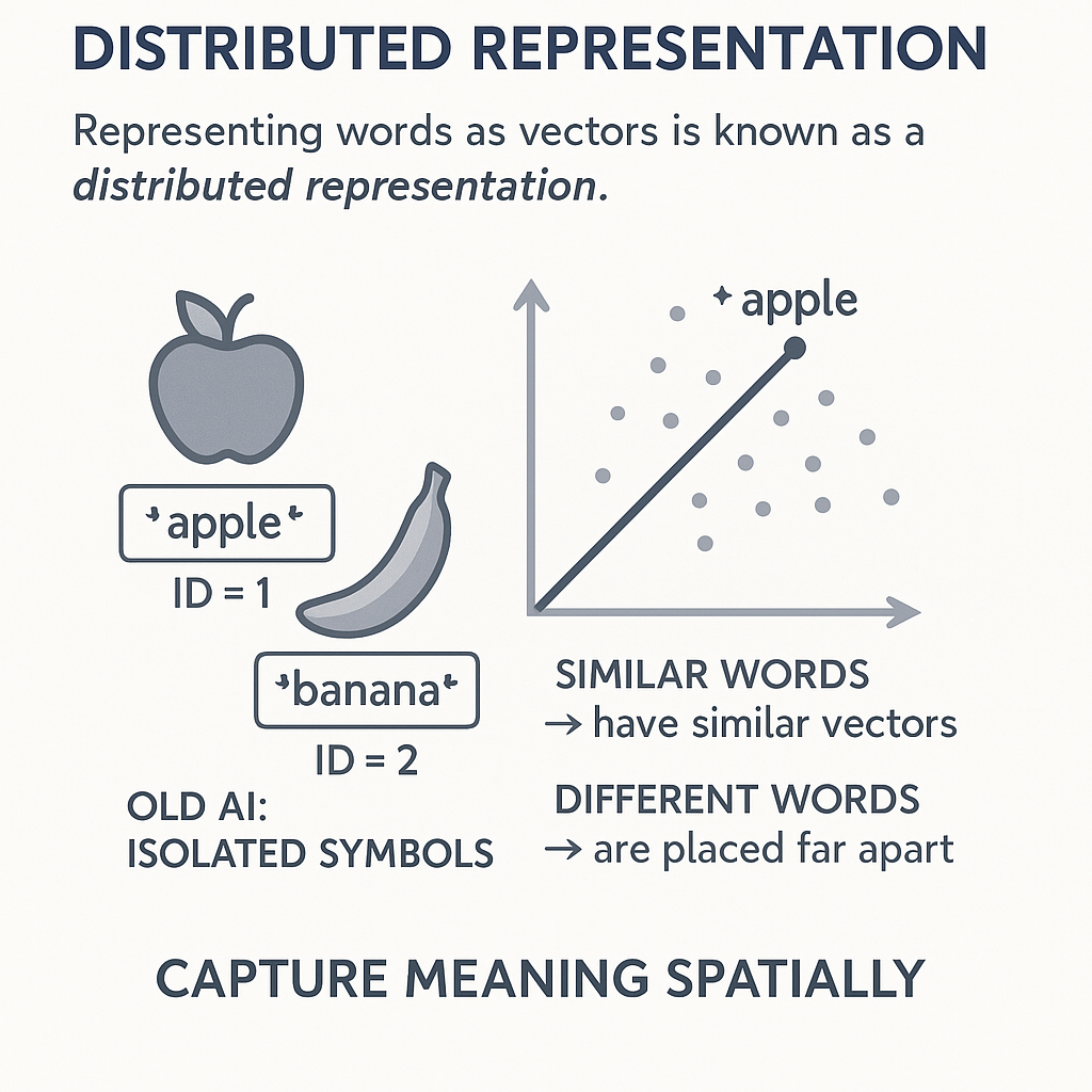 In the past, AI treated each word—like “apple” or “banana”—as an isolated symbol, such as ID=1 or ID=2.