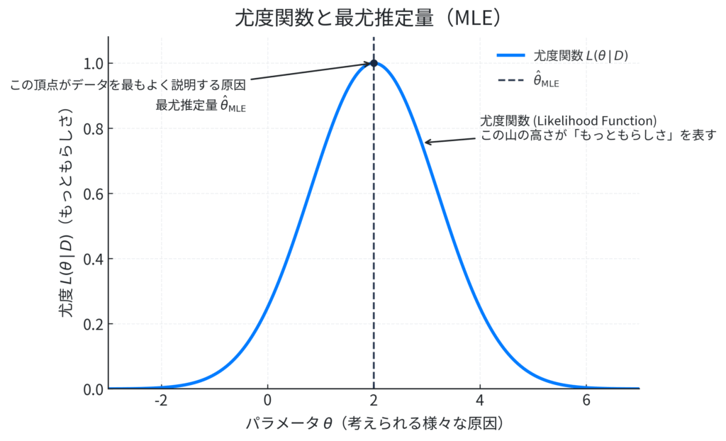 この図は、いわば「もっともらしさの山」です。横軸(\(\theta\))には、考えられるすべての原因が並んでいます。例えば、「新薬Aの真の奏効率」が0%から100%までのどの値か、といった候補たちです。縦軸(\(L(\theta \mid D)\))は、それぞれの原因を仮定したときの「もっともらしさ」、つまり尤度を表します。そして、この山の頂上、つまり尤度が最も高くなる地点。そのときの横軸の値(この例では\(\hat{\theta}_{\text{MLE}}\))こそが、「手元のデータから判断するに、最も確からしい原因はこの値だろう」という結論、すなわち最尤推定量なのです。