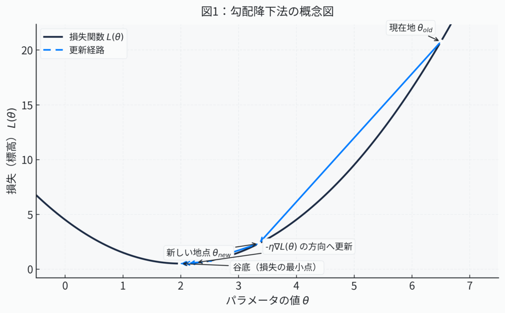まず、損失関数という広大な「地形図」の上で、AIは自身の現在地(現在のパラメータ \( \theta \) の値)を確認します。そして、その地点における勾配(gradient)を計算します。勾配とは、その地点における「坂の傾きが最も急になる方向と、その傾きの大きさ」を示す情報が詰まったベクトル(矢印)です。重要なのは、この勾配が指し示す方向は、慣例的に「最も急な上り坂」の方向であるという点です。数学的には、これは損失関数 \(L\) を各パラメータ(\(\theta_1, \theta_2, \dots\))で一つずつ偏微分することで求められます。偏微分とは、たくさんの変数がある関数について、「ある一つの変数だけを動かしたら、関数の値がどれだけ変化するか」を調べる操作です。これを全パラメータについて行うことで、全体として最も損失が増える方向がわかるのです。 - Step 2: 最も賢い「次の一歩」を踏み出す(パラメータの更新)