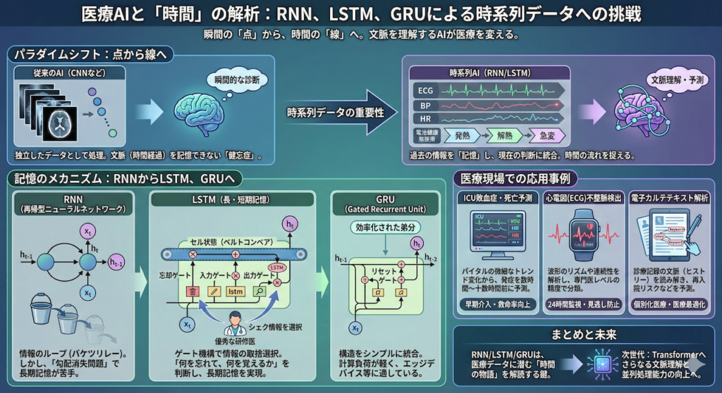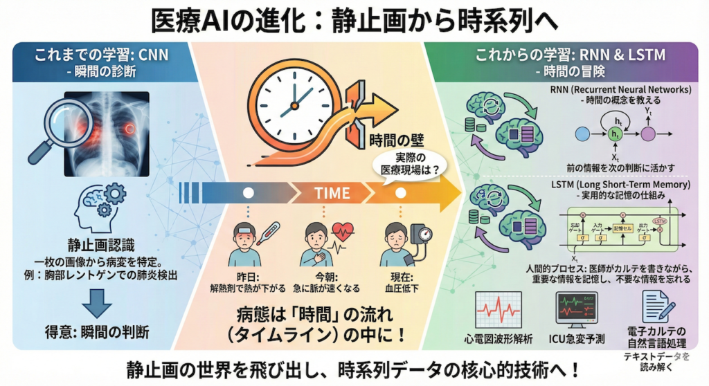 こんにちは。これまで私たちは、AIに「画像」を認識させる技術、CNN(畳み込みニューラルネットワーク)について学んできました。一枚の胸部レントゲン写真から肺炎の影を見つけ出すような技術は、いわば「瞬間の診断」を得意とするものです。
