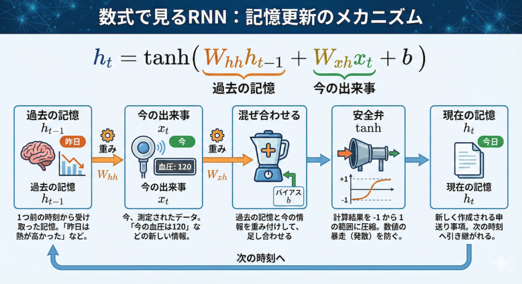 \[ h_t = \tanh( \underbrace{W_{hh} h_{t-1}}_{\text{過去の記憶}} + \underbrace{W_{xh} x_t}_{\text{今の出来事}} + b ) \]