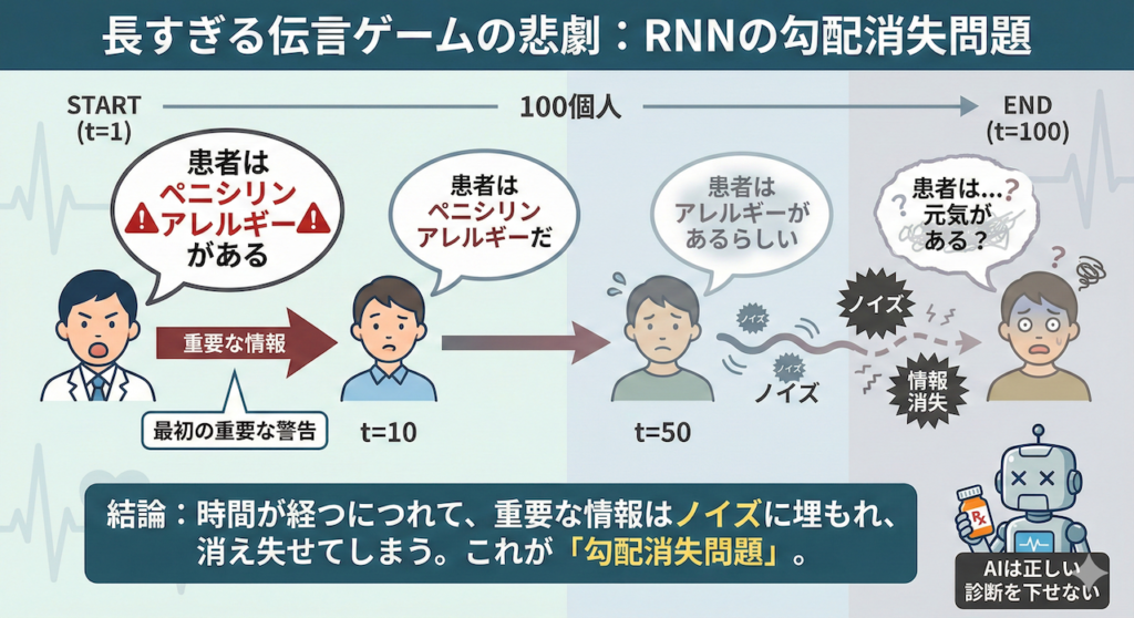 理論上、RNNは過去の情報をすべて覚えているはずです。しかし、実際に運用してみると、ある致命的な弱点が露呈しました。それは、「昔のことをすぐに忘れてしまう」という問題です。