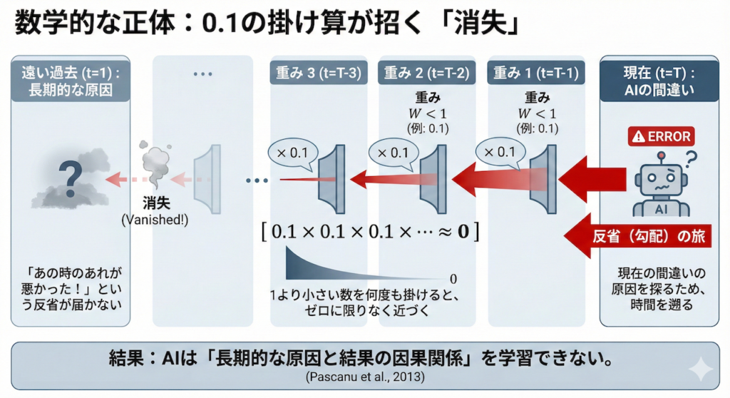 これは、「あの時のあれが悪かったんだ!」という反省(勾配)が、過去に届く前に消滅してしまうことを意味します (Pascanu et al., 2013)。結果として、AIは「長期的な原因と結果の因果関係」を学習できなくなってしまうのです。