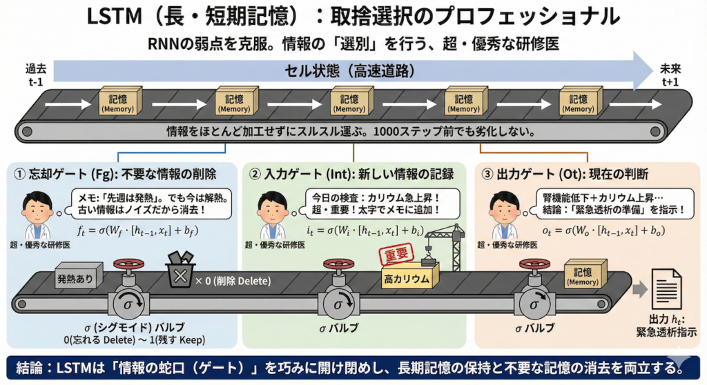 ただ情報を流すだけのRNNとは違い、LSTMは情報の「選別」を行います。それはまるで、膨大なカルテの中から重要な情報だけをピックアップし、不要な情報は容赦なく捨てていく、「超・優秀な研修医」のような存在です。