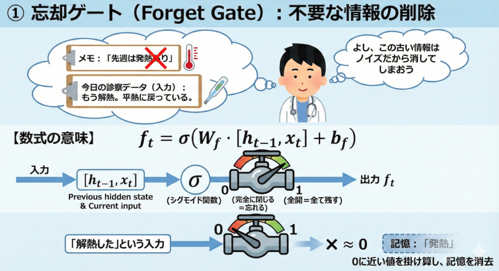 ① 忘却ゲート(Forget Gate):不要な情報の削除