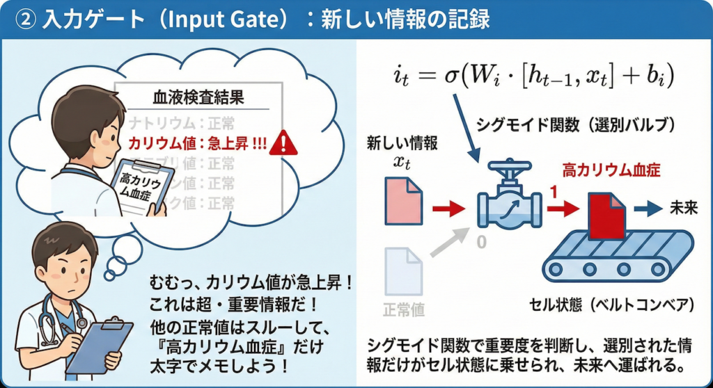 ② 入力ゲート(Input Gate):新しい情報の記録