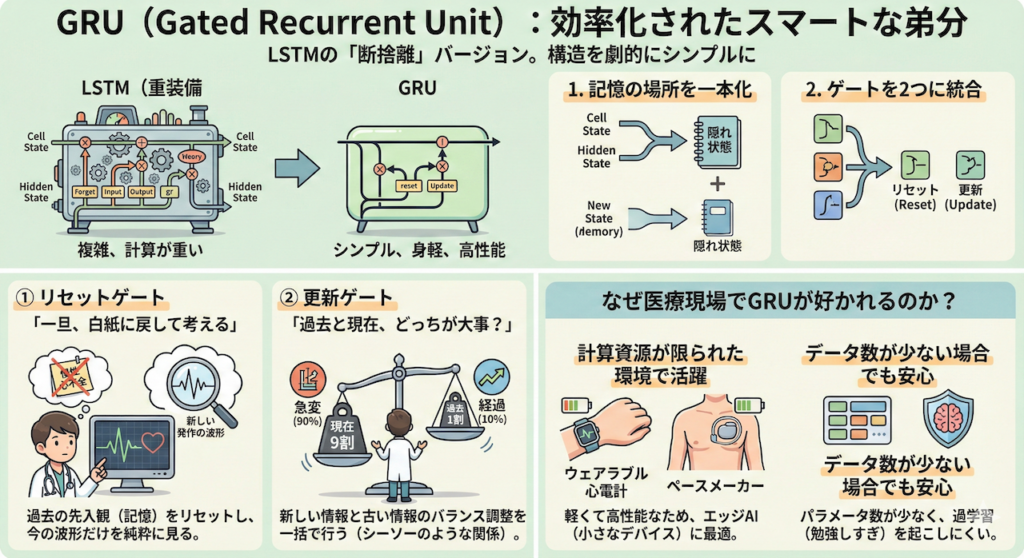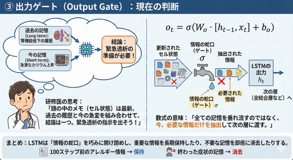 アルファベットが並ぶと難しそうに見えるかもしれませんが、その仕組みは驚くほど人間的です。それはまるで、「医師が患者の経過を診てカルテを書きながら、重要な情報を記憶し、もはや不要になった情報を忘れていくプロセス」そのものと言えます。