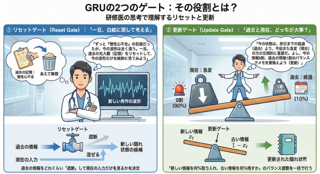 この3つのゲートの働きを、「患者さんの経過をメモし続ける研修医」の頭の中身に例えて、徹底的に分解してみましょう。