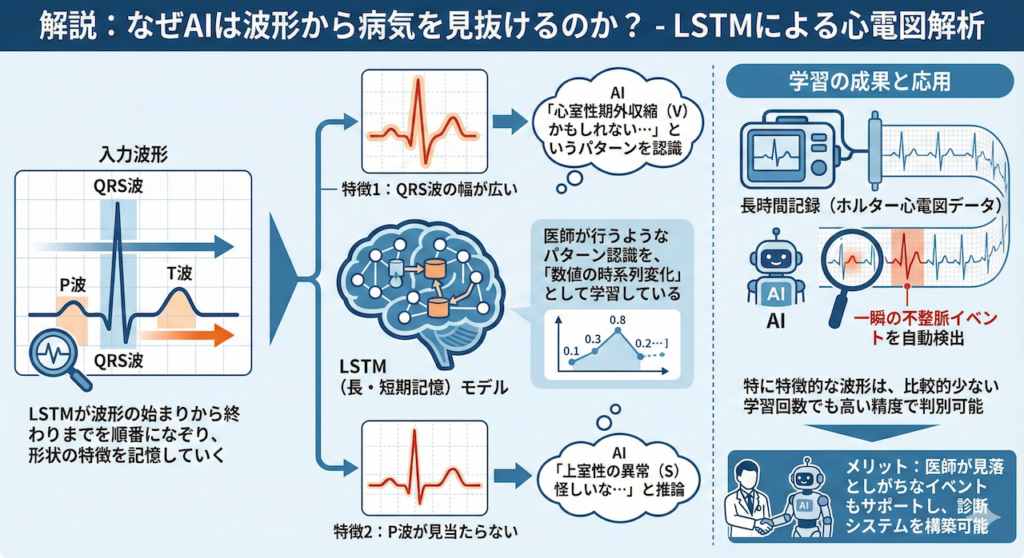 このモデルでは、LSTMが波形の「始まり(P波)」から「終わり(T波)」までを順番になぞりながら、形状の特徴を記憶していきます。