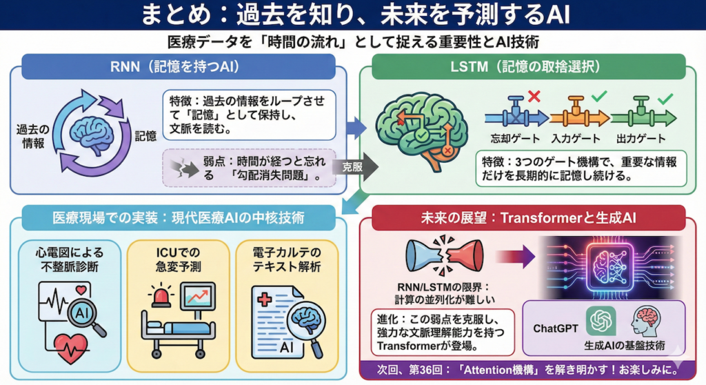 今回の講義では、医療データを「一瞬の点」ではなく「時間の流れ(線)」として捉えることの重要性と、それを解析するAI技術について学びました。ポイントを振り返りましょう。