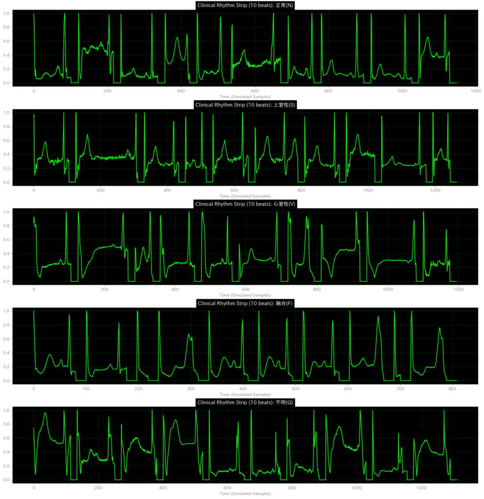 今回使用したデータセットは、AIが計算しやすいように、心拍を1つずつバラバラに切り刻み、高さ(電圧)を0〜1に無理やり引き伸ばす加工(正規化)がされています。その過程で、P波の一部が切り落とされたり、ノイズが強調されたりしています。 - つなぎ目の違和感: